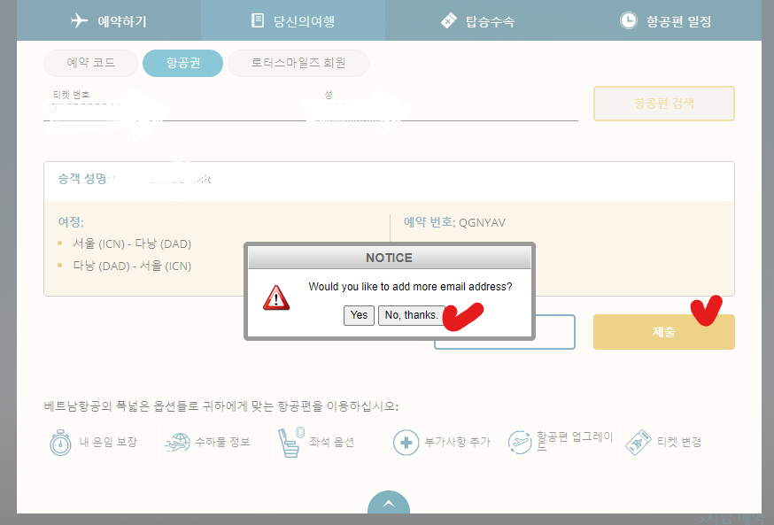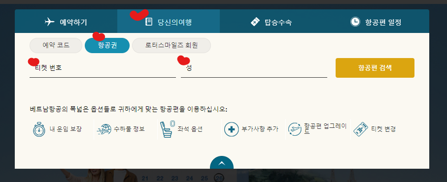 2. 당신의 여행 선택 후 항공권 선택 후 티켓번호 / 성 입력